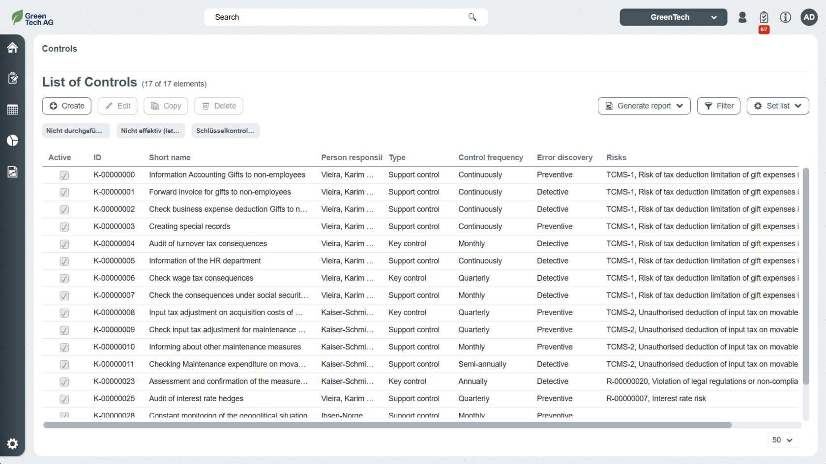 - Visualisation of the effectiveness of the controls via freely definable control results