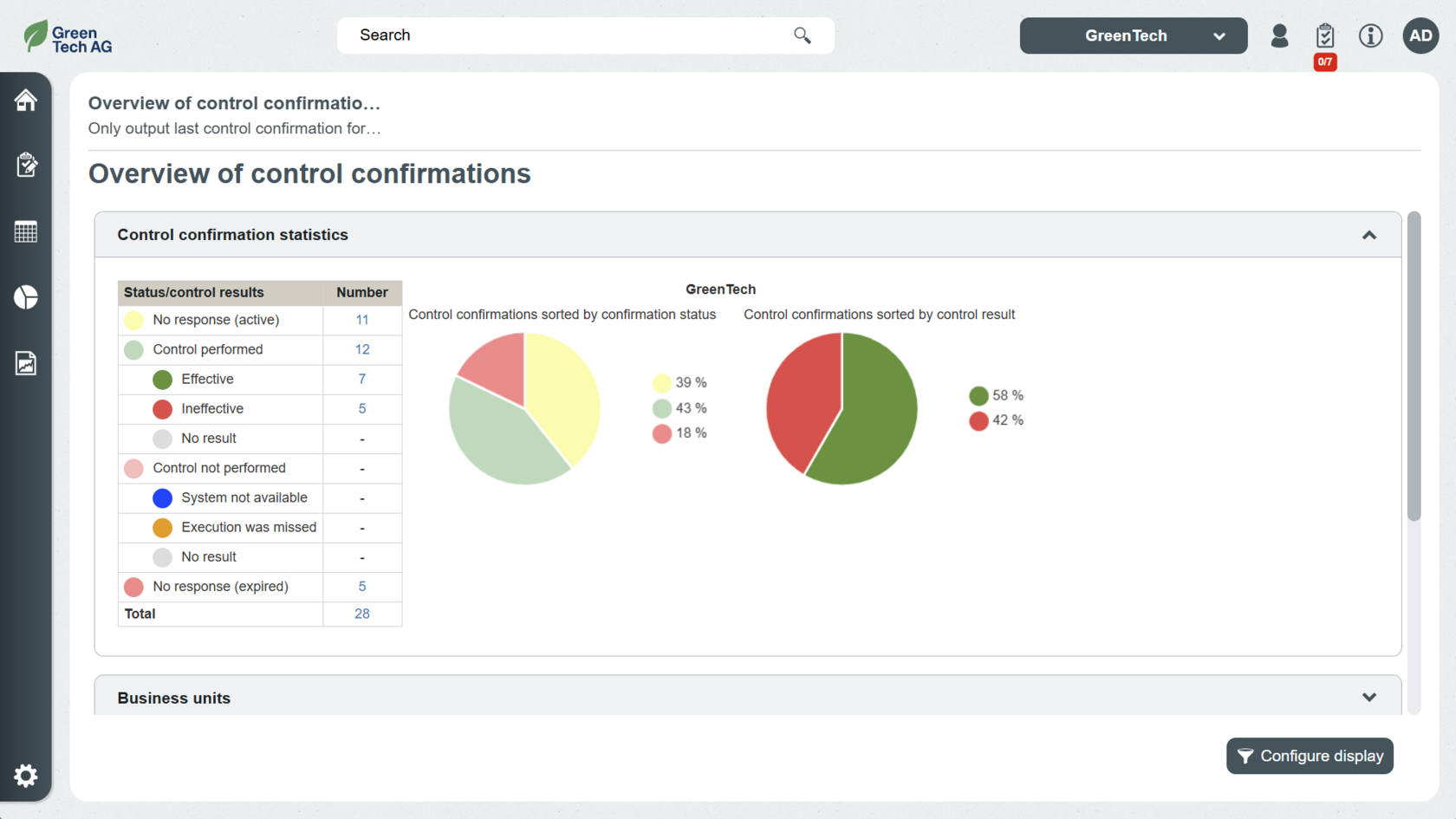 - Evaluation for the analysis of control confirmations (confirmation status, control result) according to different dimensions (organisational structure, processes)