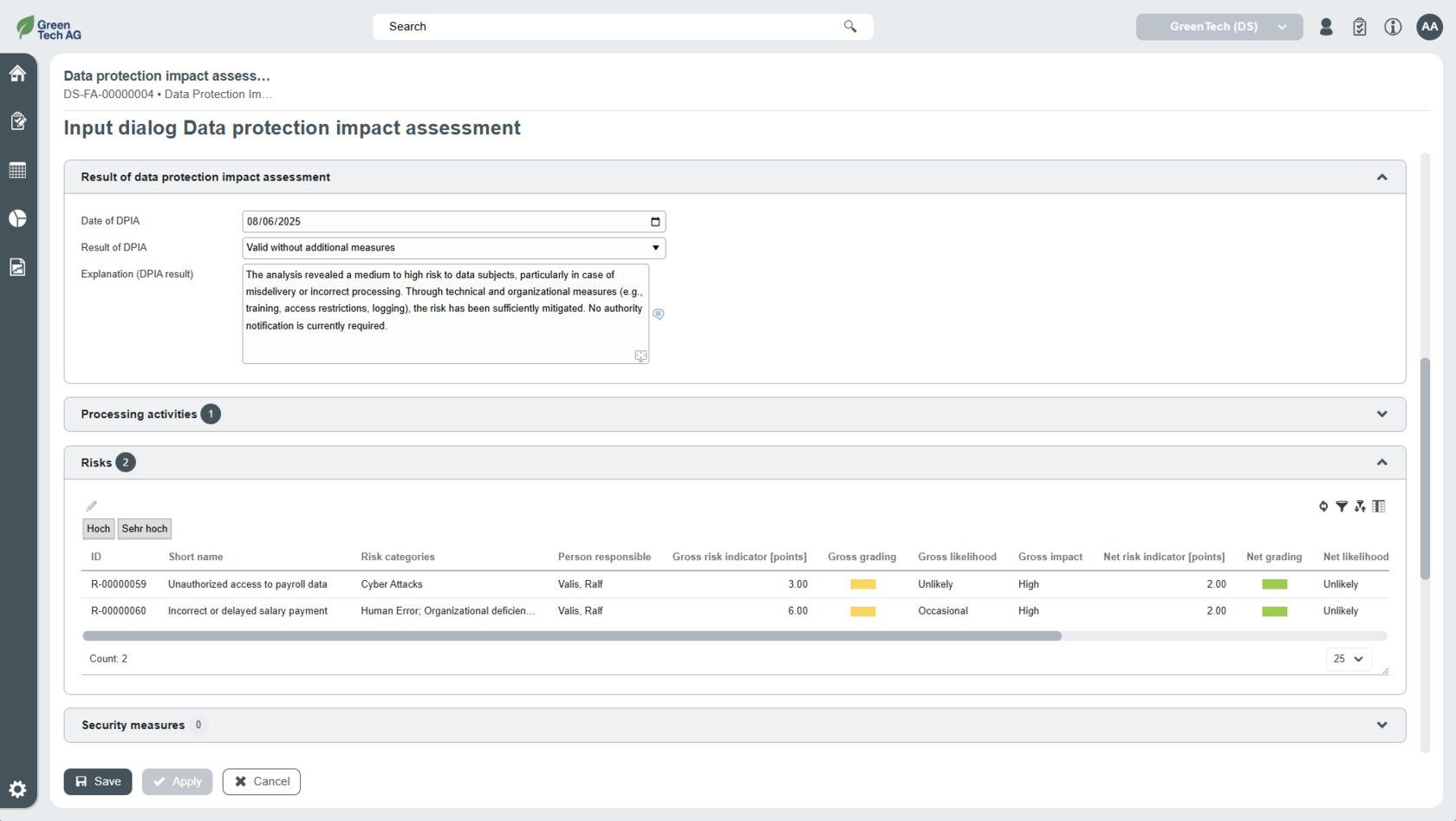 - Our solution supports you in deciding whether it is necessary to carry out a data protection impact assessment. This can be created for one or more processing activities.