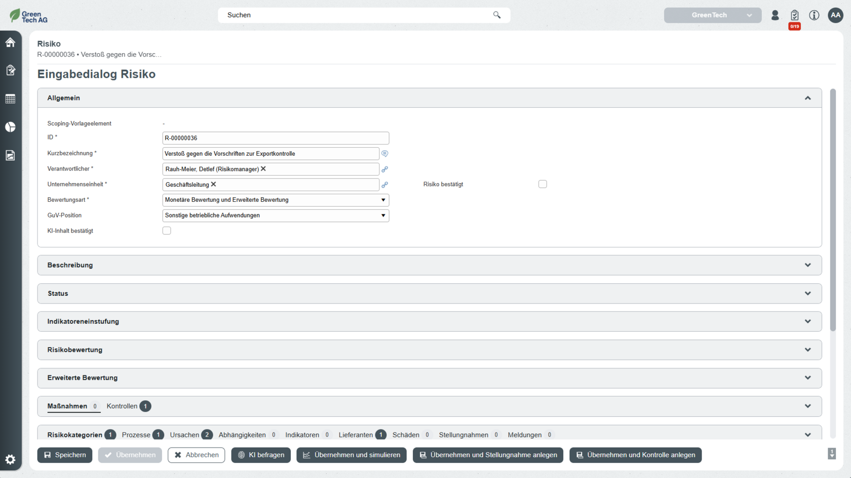 - Nutzung beliebiger Dimensionen für die nicht-monetäre Risikobewertung, z.B. ESG (Environment, Social, Governance), Reputation, Umwelt, Strafbarkeit, etc.