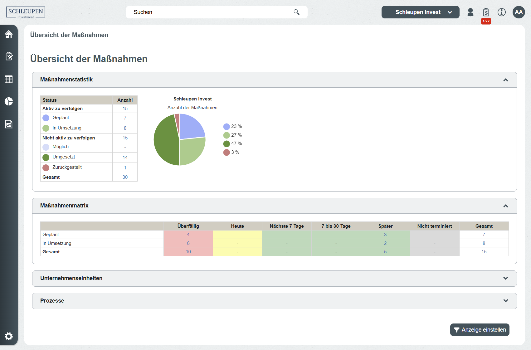 Starten Sie direkt auf Ihrer Mein-Portfolio-Seite und behalten Sie alle selbst verantworteten Elemente im Blick. Analysieren Sie Ergebnisse auf übersichtlichen Auswertungsseiten und leiten Sie bei Schwachstellen gezielt Maßnahmen mit klaren Verantwortlichkeiten und Terminen ab. Profitieren Sie von automatischer Terminüberwachung, konfigurierbaren Erinnerungs-E-Mails und integriertem Maßnahmenmanagement. Alle Änderungen werden revisionssicher journalisiert, und dank Historisierung erstellen Sie jederzeit belastbare Berichte